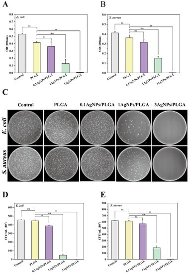 Analysis of viability of E. coli (A) and S. aureus (B) regarding the different AgNPs/PLGA scaffolds. (C) The antibacterial effect of different AgNPs/PLGA scaffolds was demonstrated via plate spreading. (D,E) The bacteria were quantified by counting CFU after treatment with the scaffolds. (ns represent no significance; * represent p < 0.05; **, ##, and && represent p < 0.01).