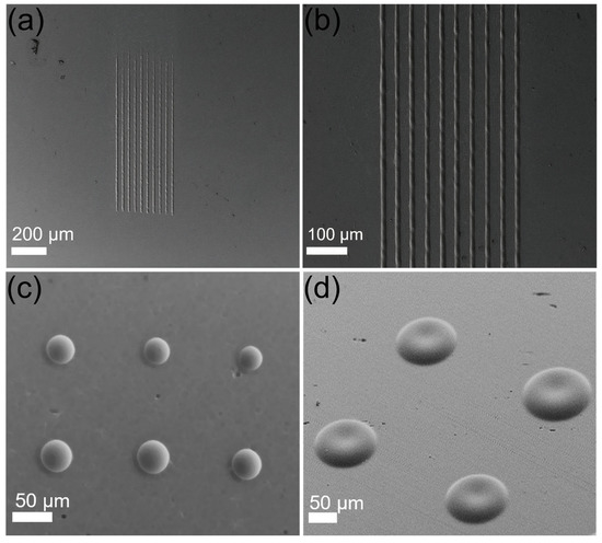 FESEM images of the micro-optical structures: (a,b) one-dimensional (1D) diffraction gratings at different magnifications; (c) microlenses fabricated at an average power of 11 W and at the different pulse repetition rates of 20 kHz (above) and 23 kHz (below); (d) tilted view of microstructures with a dip at the tip written at an average power of 16 W and 20 kHz.