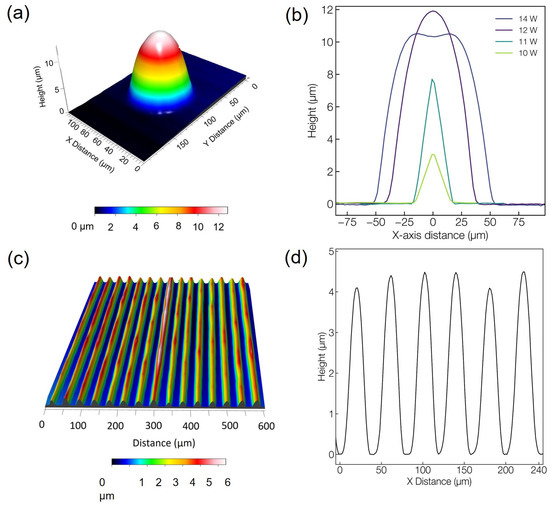 Profilometer images of the micro-optical structures: (a) microlens fabricated at 12 W; (b) 1D trace of microlenses generated at a different average power; (c) diffraction gratings’ 3D image and (d) corresponding 1D trace.