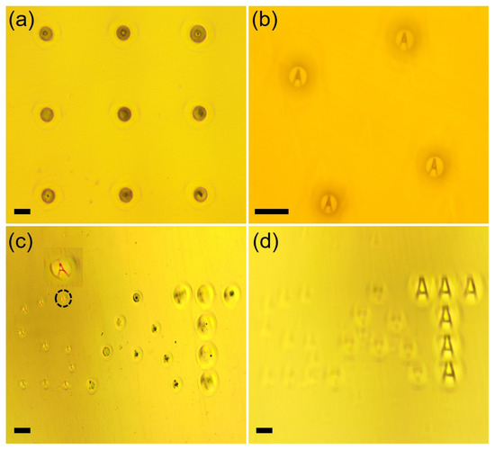 (a) Optical micrograph of the MLA; (b) imaging of mask ‘A’ by the MLA; (c,d) imaging performance of patterned microlenses with different focal planes for each patterned alphabet letter. Scale bars equal to 100 µm.