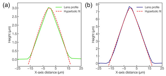 where and represent the parameters defining the hyperbolic profile with the respective values: (a) = 1, = 3.97; (b) = 1, = 1.95. As observable from the figure, the profile of the microlens matches well with the hyperbolic equation fitting with the selected parameters. The resulting focal length in the hyperboloid microlens case can then be calculated from the following equation [46]: