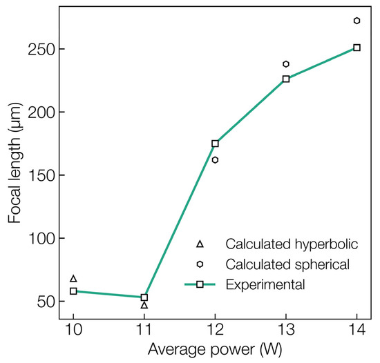 Figure 6 shows the comparison between the calculated and experimental focal lengths of the microlens for both the hyperboloid and spherical shapes fabricated at varying laser average power. The focal length of the microlenses revealed to be tunable from about 50 to 250 µm. Such a multifocal imaging system would enhance the optical diagnosis capability of an in vivo measurement system. Another important observation concerns the relatively greater deviation of about 20 µm between the calculated and experimental focal length values for the microlens fabricated at a higher average power of 14 W. Furthermore, the focusing performance of these microlenses is relatively poor, especially in terms of image sharpness, as shown previously in Figure 4d. This effect can be attributed to the deviation of the lens from the ideal spherical shape as previously depicted by the profilometer trace in Figure 2b, where the lens tip exhibits a slight dip as a result of rapid vaporization and recoil pressure.