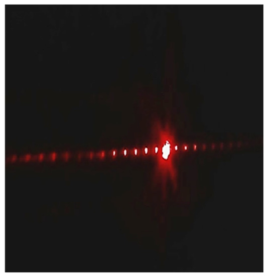 As observable from the figure, the higher-order diffraction patterns are clearly distinguishable and display a good diffractive property. It must be noted that, as the groove spacing decides the spatial propagation of the diffracted wavefront and therefore the pattern spacing, the spatial properties of the diffraction pattern are tunable depending on the spacing between the laser scan lines during the fabrication step. Furthermore, the optical performance of the fabricated grating was quantitatively evaluated to obtain the grating efficiency , which is given by:
