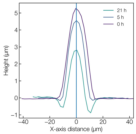 Finally, the dissolution property of the fabricated laser microstructure was tested by immersion in a PBS solution (pH = 7.4). Microlens features that were fabricated at the average power of 10.5 W and 20 kHz were considered for the dissolution experiment and the topographical analysis was performed at different time intervals (see Figure 8). In a span of 21 h, the microlens’ height reduced by about 2.5 µm, a value that is consistent with previously obtained data [47]. However, since the microlens’ cross-sectional diameter is not symmetric with its height, a specific dissolution rate cannot be specified. Another interesting observation concerns the fact that a preferential dissolution occurred along the laser-modified region in comparison to the unmodified glass surface, thereby etching deeper into the microlens’ base as compared to the bare glass surface.
