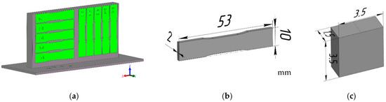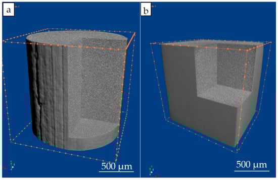 Figure 3a,b), along with rectangular prisms for the construction of 3D metallographic models of different sections of the examined samples and for micro-focus tomography (