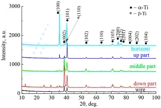 Table 5). In samples cut from the side surface that were oriented horizontally, the impurity phases are absent; only the main phase, α-Ti, and small amounts of β-phase can be observed. A significant redistribution of the intensities of the main α-Ti phase can be observed, depending on the section of the studied object from which the samples were cut for study. The diffractogram obtained from the wire clearly shows a predominant orientation in the <001> direction—the direction of wire formation characteristic of the hexagonal crystal lattice. In the lower part of the sample, a pronounced predominant orientation in the same <001> direction can be seen—the texture is in a direction perpendicular to the substrate and parallel to the growth vector of the product. In the upper part of the sample, the preferential orientation of the planes (002) is preserved, but the texture is not as pronounced as in the lower part. This may be due to the changing conditions of heat dissipation during growth—the lower part of the sample is periodically heated and cooled during the deposition of the overlying layers, but the heating temperature decreases as the number of layers increases. In the upper part of the sample, the number of such cycles is less than in the lower part. Thus, the repeated heating and cooling in both parts of the object contribute to the growth of the grain structure of the basic α-phase in the growth direction of the sample; however, in the lower part, the volumetric growth of the α-phase is reduced (
