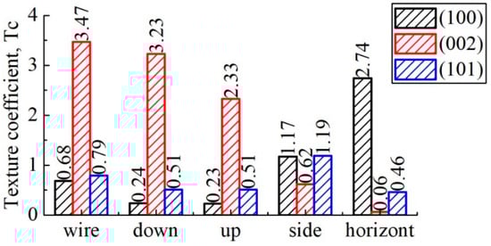 Table 7). Samples cut from the side surface of the sample do not show a similar pattern. The heat exchange conditions there are different—in addition to repeated heating and cooling, the temperature of which changes with each new layer applied, the side surface is also the interface between the solid and gaseous phases, an area where the heat exchange conditions change significantly. In addition, since the application of each new layer is accompanied by a local transition of the wire to the liquid phase, in some areas of the lateral surface, there is a boundary with three phases, namely, solid/liquid/gas. Such temperature conditions of product formation lead to a change in the crystallographic orientations of the growing crystallites, which, in turn, leads to the redistribution of intensities of the main phase reflexes on diffractograms. In samples cut according to the horizontal plane of the studied object, this preferential orientation is observed in the plane that is parallel to the substrate. The most pronounced plane family is (100). At the same time, the intensity of plane (002) in such samples is minimal. Such intensity behavior indicates that the thickness of the examined specimens does not exceed the thickness of an applied layer.