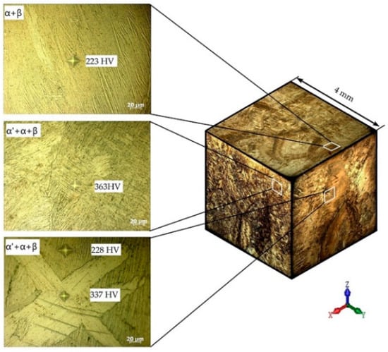 Figure 8). There is a basic α-Ti phase with the insignificant presence of a β-Ti phase. At the same time, the levels of concentration of the alloying elements in the starting material did not allow for obtaining hardness characteristics corresponding to the values obtained with Ti-6Al-4V alloys. It should be noted that the metallographic analysis also showed a difference in the microstructure of the printed alloy from the wire and that previously obtained from alloys such as Ti-6Al-4V.