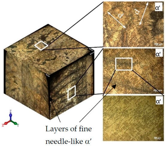 z-axis. Each columnar grain has alternating black layers at a distance of h = 0.8–2.0 mm, with a crushed structure formed by the passage of the electron beam and the formation of each new layer. The light layers represent a Widmannstett non-equilibrium basket-type structure of α′ phase colonies with different crystallographic orientations, exhibiting a high density of dislocations and twins. The formation of such a structure is indicative of the overheating of the liquid melt with temperatures in the β-area of above 1020 °C, along with the subsequent accelerated cooling due to the additional influence of the surrounding atmosphere at the edge of the sample wall. Such a structure has inflated values of hardness (375–380 HV) and strength.