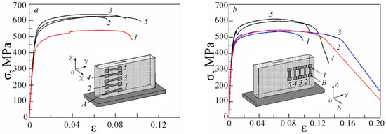 Figure 15 shows the strain curves, taking into account the changes in the cross-sectional area of flat specimens under uniaxial tension at the coordinates “σ