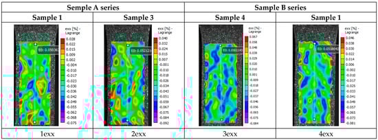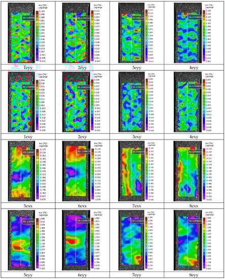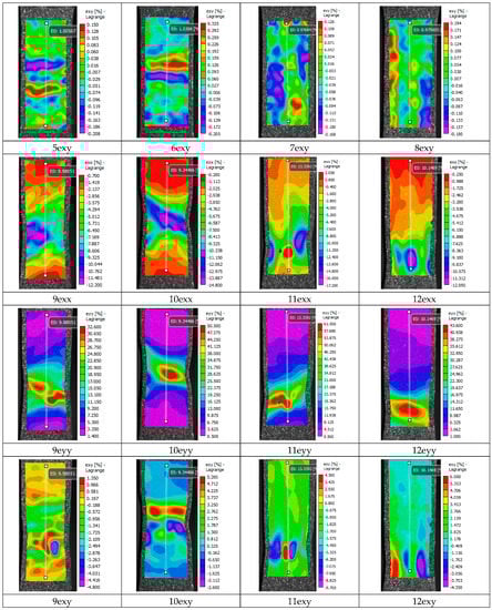 Figure 16 shows pictures (images 1–16) of the distribution of strain fields on the surface of specimens of series A and series B, taken in the process of the uniaxial tensioning of the specimen. On the basis of an analysis of the data presented in the figures regarding the distribution of deformation fields of relative transverse strain ε