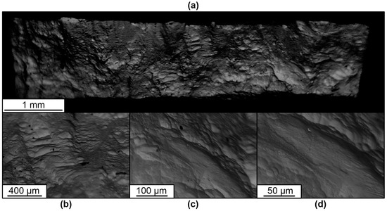 Figure 5). The heterogeneity of the color image is associated with the different thicknesses of the sample (bright areas correspond to thicker zones), which is clearly confirmed by the fact that the sample is thinner in the lower part, where the melt hardens faster. This type of heterogeneity in the surface structure is also clearly visible from the visual inspection of the printed samples. Radiography of the specimens prepared for mechanical testing, which was carried out with the help of the “Orel-MT” microtomograph with a sensitivity of up to 15 microns, allowed us to reveal the presence of a small number of pores with sizes of less than 200 microns on some specimens (