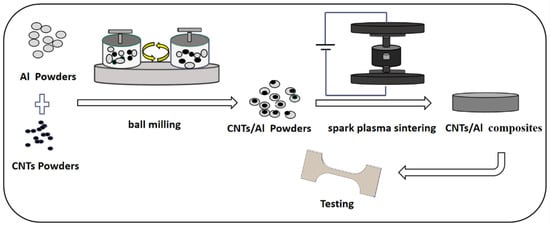 Aluminum and alloys are widely used in fields such as aerospace, transportation, and other industries that demand high strength and lightweight materials due to their low density, high specific tensile strength, good corrosion resistance, and high thermal and electrical conductivity [1,2,3]. Aluminum matrix composites are lightweight, high-strength, and advanced composites that synergize with aluminum and its alloys by incorporating high-performance reinforcements [4,5]. Carbon nanotubes have excellent mechanical properties such as a high Young’s modulus, high strength, high thermal conductivity, low density, good chemical stability, and a self-lubricating effect, making them promising reinforcing materials for metal matrix composites [6,7]. The main challenge in the preparation of CNT/Al matrix composites is to resolve the dispersion of CNTs and the interfacial bonding between CNTs and the Al matrix [8,9] The primary methods for preparing composite materials include in situ autogenous, molecular level mixing, stirring and friction, wet mixing, and powder metallurgy [8,10,11,12,13,14]. Among these methods, powder metallurgy is preferred by researchers due to its ability to disperse CNTs uniformly and maintain their integrity well. Commonly used powder metallurgy processes include cold pressure-less sintering, hot-pressure sintering, and discharge plasma sintering [3]. Kuzumaki et al. [15] used a hot-pressure sintering process to sinter solution-mixed Al-5 vol.% CNTs composite powder at 600 °C for 1.5 h. However, the poor dispersion of CNTs resulted in a tensile strength (TS) of only 80 MPa, which was even lower than that of pure aluminum. Nevertheless, the high-temperature stability of the prepared composites improved significantly compared to pure aluminum. Singh et al. [16] first ball-milled (180 r/min) aluminum powder for 10 h, sonicated (4 h) functionalized carbon nanotubes, mixed them with the powder, and then further ball-milled (100 r/min for 15 min). Then, Al–CNT (0.75 and 1.5 vol.%) composites were prepared by discharge plasma sintering. They achieved a TS of 217 MPa (161 MPa for Al) and a failure strain of 4.7% (6.6% for Al) for Al0.75 vol% CNT composites. Low ball-milling speed and low ball-milling time led to the presence of carbon nanoclusters, and the tensile properties of the Al-1.5 vol% CNT composites (126 MPa TS and 3.3% elongation) were poorer than those of the Al samples. Liu et al. [17] investigated the effect of different ball-milling times on the properties of CNT/Al composites, and it was found that mechanical ball milling from 8 to 12 h led to severe damage of the CNTs, resulting in interfacial reactions between CNT and aluminum to form Al4C3 and a decrease in the properties of the composites. The best mechanical properties of the composites were obtained when the ball-milling time was 6 h. Junhui Nie et al. [18] prepared composites with CNT content of 0–2 wt.% by mechanical ball milling mixing combined with discharge plasma sintering technique. The results show that the tensile strength and Vickers hardness of CNT/Al composites increase by 29.9% and 13.2%, respectively, when the CNT content was 0.5 wt.% compared to pure Al. The decrease in the mechanical properties of the CNT/Al composites with increasing CNT content was attributed to the presence of CNT clusters in the matrix. Run et al. [19] prepared CNT/Al composites with a CNT content of 1.5 wt.% by using a variable-speed ball-milling technique combined with sheet powder metallurgy. They found that the low speed combined with high-speed ball-milling method could better disperse CNTs on the surface of aluminum powder without causing serious damage to the structure of CNTs. The tensile strength of the composite increased from 311 MPa to 408 MPa for pure aluminum, and the elongation was reduced to 4%.