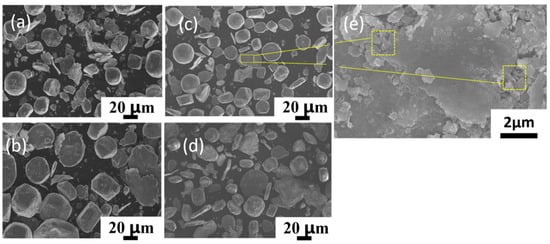 Figure 3 shows the powder morphology at different ball-milling times. To increase the attachment surface for the CNTs, ball milling was performed at a low speed for a long time. This has the advantage that after a significant amount of time, the powder gradually becomes flaky, thereby increasing the surface area, while, at the same time, not significantly damaging the structure of the CNTs. As shown in the Figure, with the increase in ball-milling time from 6 h to 9 h, the powder gradually changes from spherical to flaky. Figure 3a shows that a large number of small particles gather together during the ball-milling process due to shear forces, becoming irregularly shaped, and the originally spherical powder became ellipsoidal. Figure 3b–d are the powder morphologies of 7 h, 8 h, and 9 h ball milling, respectively. With the increase in time, most of the ellipsoid powder is deformed into flat sheets, but the powder surface of 9 h ball milling becomes rougher, because anhydrous ethanol is added as the process control agent during powder mixing to prevent cold welding. Therefore, after a long time of ball milling, the surface of aluminum powder is oxidized to Al3O2 [26]. which makes the surface of the powder change. Compared with the ball milling for 6 h, the shape of the powder becomes more regular at other times, which is due to the fact that with the increase in ball-milling time, some small-sized powders agglomerate and are continuously squeezed into regular flakes. However, the ball-milling time should still be controlled within a reasonable range to prevent the heavy oxidation of the powder. Figure 3e shows the magnified morphology of ball milling for 8 h, in which CNTs can be clearly seen to be uniformly extruded in the Al powder, indicating that ball milling for 8 h can uniformly disperse CNTs. Figure 4 shows the graph of powder particle size at different times of ball milling. It can be observed that with the increase in ball-milling time, the powder particle size gradually becomes larger. This conclusion can also be proved by combining Figure 3, the average particle size of the original spherical powder, which is 50 μm, with the increase in milling time, the powder is constantly squeezed by collision and gradually becomes a flake, so the powder size also increases.