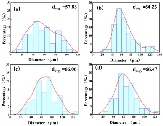 Particle size distribution of CNT/AlSi10Mg composite powder (a) 6 h. (b) 7 h. (c) 8 h. (d) 9 h.