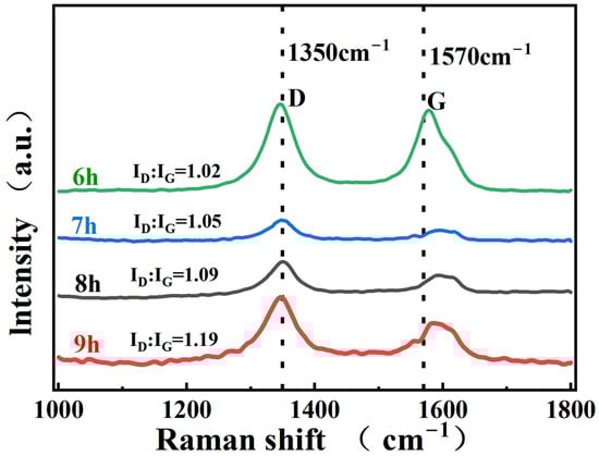 To assess the structural integrity of the CNTs, Raman spectroscopy was used to test the composite powders. The representative peaks of CNTs are mainly the G peak at 1570 cm−1 and the D front at 1350 cm−1. The D-peak indicates the defective nature of the carbonaceous structure, and the G-peak indicates the integrity of the CNTs. Therefore, the ID/IG ratio is commonly used to reflect the integrity of the CNTs [27]. The original ID/IG of the acid-washed CNTs is 0.98, and Figure 5 shows that the ID/IG ratio of the CNTs increases after different ball-milling times, reflecting the increase in defects and damage to the integrity of the CNTs. The longer the ball-milling time, the deeper the damage to the integrity of the CNTs. The G-peaks of the CNTs ball-milled at different times are shifted to the right, which is due to the deformation of the structure caused by the thermal compression of CNTs during ball milling, and the length of the C=C bond is also reduced, so the peak is shifted to the right. To obtain composites with excellent mechanical properties, the ball-milling time should be controlled within an appropriate range to reduce damage to the CNTs.
