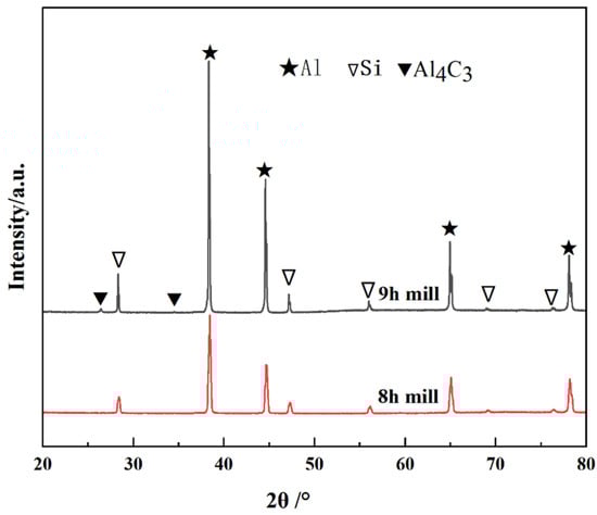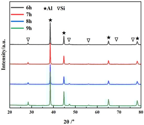 Figure 6 shows the XRD patterns of the CNT/AlSi10Mg composite powder with different ball-milling times. The results indicate that with the extension of the ball-milling time from 6 to 9 h, most of the phases in the CNT/AlSi0Mg composite powder are Al, and a small amount of Si is contained in the AlSi10Mg powder. In addition, the diffraction peak corresponding to CNTs is not found on the atlas. This is because the amount of CNTs added is too small, and it is also mentioned above that CNTs are coated by Al particles after a long time of mechanical ball milling, so it is difficult to detect them. The diffraction peaks are pure Al and pure Si, indicating that no other impurities are introduced during the 6 h to 9 h mechanical ball-milling process.
