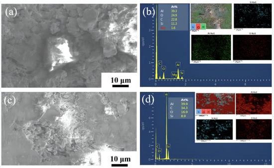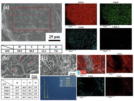 Figure 18 shows the corrosion morphology of CNT/AlSi10Mg composites with different CNT content. Figure 18a shows the corrosion morphology of the 0.2 wt.% CNT/AlSi10Mg composites. After the 0.2 wt.% CNT/AlSi10Mg composite specimens are corroded by the 3.5 wt.% NaCl solution, the surface oxide layer film is destroyed and the internal Si particles are exposed. This is because when a small amount of CNT is added, a potential difference is formed between the CNTs and Al matrix [36], which forms an electrochemical cell with the aluminum matrix and causes galvanic corrosion. Additionally, the presence of the second phase increases the pores at the composite interface, making it easier for chloride ions to penetrate and reducing the material’s corrosion resistance [37]. Figure 18b reveals that the corrosion products are primarily Al2O3. Figure 18c shows the corrosion morphology of the 0.8 wt.% CNT/AlSi10Mg, which exhibits pitting corrosion. Compared to the 0.2 wt.% CNT/AlSi10Mg composite corrosion morphology, the 0.8 wt.% CNT/AlSi10Mg composite corrosion pits are smaller and the corrosion rate is lower, which is due to the addition of the appropriate amount of CNTs that are uniformly dispersed in the Al matrix. The good corrosion resistance of CNTs can further hinder the corrosion and improve the corrosion resistance of the material, which is consistent with the conclusions obtained in Figure 16 and Figure 17.