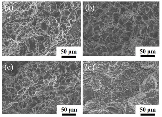 The fracture surfaces of CNT/AlSi10Mg composites with different CNT content: (a) 0.5 wt.% CNTs. (b) 0.8 wt.% CNTs. (c) 1.1 wt.% CNTs. (d) 1.5 wt.% CNTs.