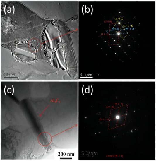TEM images with the corresponding SAED of 1.1 wt.% CNT/AlSi10Mg composites (a) a bright TEM image of 1.1 wt.% CNT/AlSi10Mg composites. (b) SAED of corresponding image. (c) The image of Al4C3. (d) SAED of Al4C3.