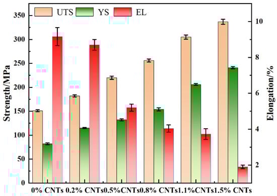 The tensile strength of the CNT/AlSi10Mg composite increases with increasing CNT content. The composite exhibits a maximum tensile strength of 337 ± 5.2 MPa and yield strength of 241 ± 2.3 MPa at CNT mass fractions of 1.5 wt.%.