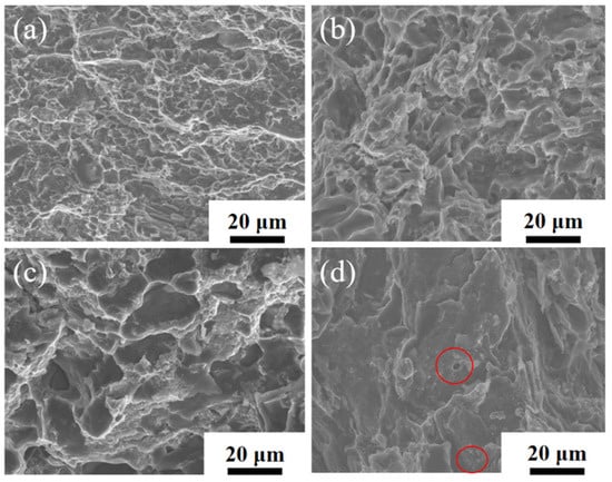 Figure 15 shows the SEM images of the tensile fracture of the CNT/AlSi10Mg composites with different CNT content. Figure 15a–c show the fracture morphologies of 0.5 wt.% CNT, 0.8 wt.% CNT, and 1.0 wt.% CNT composites, respectively, and the fracture consists of a large number of tough nests, showing ductile fracture characteristics. Figure 15d shows the fracture morphology of 1.5 wt.% CNTs, which is composed of a few tough nests and most of the tearing folds, indicating brittle fracture. In addition to a small number of dimples, there are also some cracks and some very large pores in the fracture. The formation of these pores is caused by the aggregation in some areas due to high CNT content in the composite material. In the process of tensile fracture, the fracture preferentially occurs along these agglomeration areas, which results in several aluminum particles being pulled out as a whole, thus, forming large holes, which is another reason for the reduction in the elongation of high-content CNT composites.