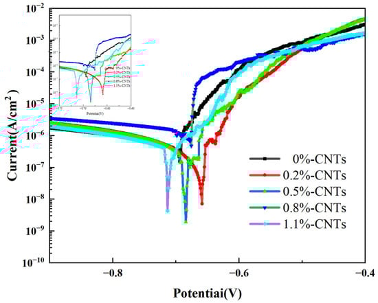 Figure 16 displays the anodic polarization curves of the CNT/AlSi10Mg composites with varying CNT content in a 3.5 wt.% NaCl solution. The overlapping curves are enlarged in the upper left corner of Figure 16 for better visualization. Table 2 presents the corresponding fitting results. The dynamic potential polarization curves of the five samples in Figure 16 exhibit similar shapes, indicating comparable electrochemical corrosion processes in the 3.5 wt.% NaCl solution. The polarization curves do not show passive regions; therefore, the type of corrosion of both materials in the 3.5 wt.% NaCl solution is an active corrosion process [33]. As shown in Figure 4 and Table 2, the composite materials with 0.2% and 0.5% CNT content exhibit slightly higher Ecorr (corrosion potential) values compared to the original material without CNTs, while Icorr (corrosion current density) displays a decreasing trend. According to Faraday’s second law [34], there is a one-to-one correspondence between the corrosion current density and corrosion rate. A higher Icorr indicates a higher corrosion rate. However, the polarization curve fitting results show that the corrosion potential of the composite specimen is low, and the corrosion current density is not much different from that of the matrix specimen without CNTs. Therefore, the corrosion rate cannot be calculated.