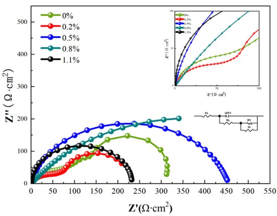 Figure 17 shows the electrochemical impedance spectra (EIS) of CNT/AlSi10Mg composites with different CNT content, which show that the Nyquist plots of the 0 wt.% CNT/AlSi10Mg and 0.2 wt.% CNT/AlSi10Mg composites consist of two distinct capacitance rings. The 0.8 wt.% CNT/AlSi10Mg composite has the largest arc radius and the 0.2 wt.% CNT/AlSi10Mg composite has the smallest arc radius. A larger diameter of the capacitive reactance indicates a higher impedance of the oxide film. The inductive loops of all the samples are affected by Cl− adsorption caused by the destruction of the oxide film on the surface of the samples [35]. Therefore, the 0.8 wt.% CNT/AlSi10Mg composite has the largest radius of circle, largest polarization resistance, and highest corrosion resistance, while the 0.2 wt.% CNT/AlSi10Mg composite has the smallest radius of circle, smallest polarization resistance, and worst corrosion resistance. The electrochemical impedance spectra were analyzed and fitted using ZSimpWin software, and the equivalent circuit fitting results are shown in Figure 17.