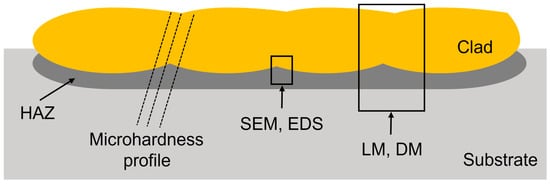 Samples for metallographic analysis were obtained by cutting along the cross-section from the surface clad to the substrate material, as shown in Figure 1. The samples were then subjected to various analyses, including microhardness measurements, scanning electron microscopy (SEM), energy-dispersive X-ray spectroscopy (EDS), light microscopy (LM), and digital microscopy (DM), to further investigate their properties.