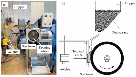 (a) Abrasive-wear resistance testing setup based on ASTM G65, (b) schematic diagram of the process.