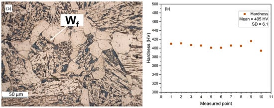 A micrograph of the substrate material, EN S355 structural steel grade, was obtained using a light microscope and is presented in Figure 4a. The microstructure mainly consists of allotriomorphic ferrite and pearlite, with traces of Widmanstätten ferrite, which is described as acicular ferrite plates emanating from a prior austenite grain boundary []. Microhardness measurements yielded an average of 405 HV with a standard deviation of 6.1 (Figure 4b), and equiaxed grains were observed in the through-thickness direction. The relatively high hardness of this steel grade is attributed to the presence of pearlite and ferrite zones with solute segregation, which can extend up to 400 µm [], making it suitable for applications requiring high strength and hardness.