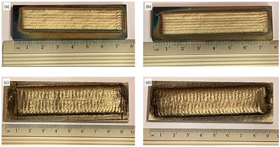 Top view of samples after cladding: (a,b) samples L1 and L2 prepared by laser cladding, (c,d) samples P1 and P2 prepared by PPTAW.