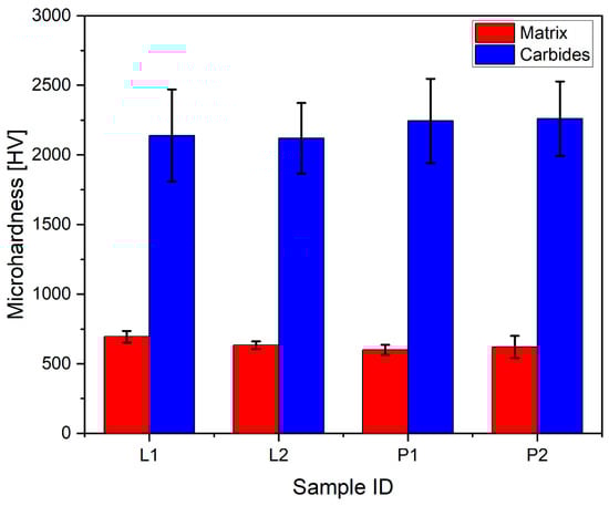 The results of room-temperature Vicker’s microhardness measurements of the prepared clads are visualized in the plot in Figure 7. It is observed that the mean hardness of the matrix phase in the clad prepared by the LC method is relatively higher than the mean of the matrix phase in the clad prepared by the PPTAW method. For the LC samples, L1 had matrix mean hardness of 695 HV and sample L2 had a mean of 634 HV. Samples P1 and P2 from the PPTAW method had matrix mean hardnesses of 600 HV and 620 HV respectively. Point measurements taken from the reinforcing carbide phases had contrasting mean values; PPTAW samples had higher values than LC samples. For LC samples, L1 had a carbide mean value of 2139 HV and L2 had a mean of 2120 HV. Samples P1 and P2 had average values of 2244 HV and 2261 HV, respectively. The standard deviations, as indicated by the bars in the plot, suggest that the mean values are not significantly further from each other. This outcome is expected because both processes are relatively high-energy-density processes, and the powder used is the same. However, it is observed in this hardness testing that sample L1 from LC showed higher hardness than sample L2. Although higher laser power introduces higher energy input in the cladding process, it is reported that increasing the laser power can also result in turbulent flow, resulting in reduced particle melting and a corresponding reduction in clad hardness []. It is also observed that sample P2 from the PPTAW method showed higher hardness than sample P1. As the PGFR was increased, the corresponding rise in plasma heat input led to higher particle temperatures, accelerating the dissolution of carbides into the matrix. This resulted in improved adhesion between the particles, leading to lower porosity and enhanced hardness, as reported by [] in a similar PPTAW study.