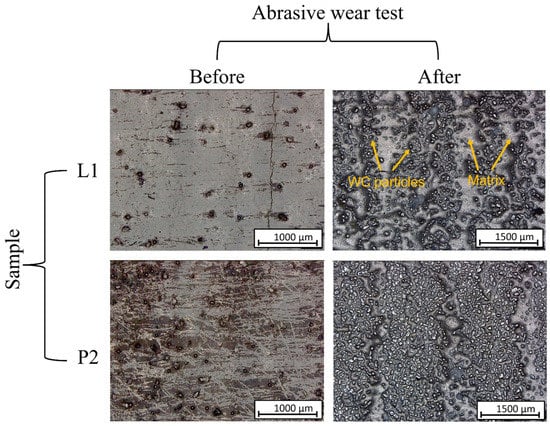 Digital micrographs of surface clads before and after abrasive-wear resistance tests for sample prepared by laser cladding (L1) and sample prepared by PPTAW (P2).