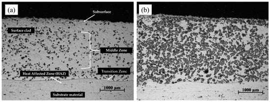 Light micrographs of prepared surface clads showing the observable zones across the cross-section: (a) sample L1 prepared by laser cladding, (b) sample P2 prepared by PPTAW.