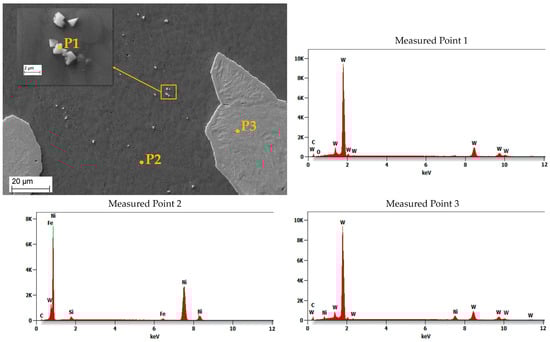 Energy-dispersive X-ray spectroscopy (EDS) microanalysis of the middle zone of surface clad for sample P2 prepared by PPTAW, showing the precipitates of secondary WC particles in the matrix.