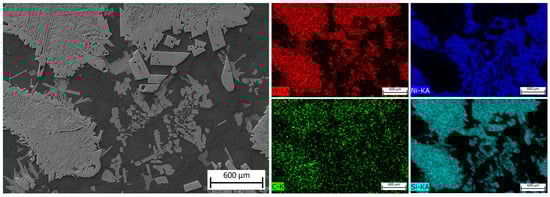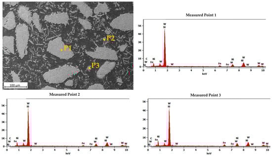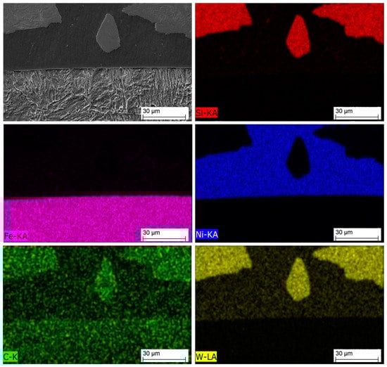 EDS maps from Figure 11 and Figure 13 confirm that the bright-grey regions in the SEM images correspond to the primary carbides, and the analyzed precipitates shown in Figure 12 and Figure 14 are the secondary precipitates nucleated from the WC reinforcing phase during solidification. The EDS maps reveal consistent segregation of Si and W in the clads produced by both methods. The heat input required to fully melt the Ni-based matrix (with a melting point of 1555 °C) surpasses the melting temperature of Si (1410 °C). Consequently, the Si phases undergo melting prior to other materials. Due to the strong tendency to form a WSi2 phase, the liquid Si forms bonds with W, leading to their observed segregation at the same locations according to EDS analysis. Döscher et al. [] reported the formation of a WSi2 phase at processing temperatures below 1414 °C, resulting from a solid-state reaction between W and Si. However, when processing temperatures exceed 1414 °C, the WS2 phase forms from a reaction between molten Si and solid W. In typical MMC clads, ceramic reinforcement particles tend to agglomerate upon solidification due to density differences between the carbides and the matrix []. However, in the samples prepared in this study using LC and PPTAW methods, agglomeration of carbides was not observed, which can be attributed to the effective mixing of powder particles, resulting in the dispersion of carbides in the matrix phase.