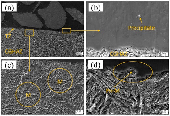 Scanning electron micrographs of sample L1: (a) overall view of the transition zone (TZ) showing the coarse-grain heat-affected zone (CGHAZ), (b) precipitation in the TZ, (c) CGHAZ martensite laths (M) in the substrate, (d) peninsula-like macrosegregation (Pn-M).