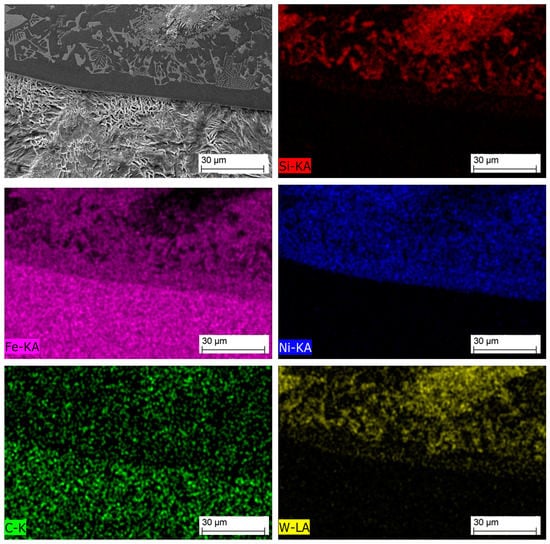Figure 17 depicts the microanalysis of the TZ in the LC sample using EDS. Similarly, Figure 18 presents the microanalysis of the TZ in the PPTAW sample. The EDS maps in these figures reveal the presence of a chemical composition gradient along the TZ, involving Si, Ni, W, C, and Fe, which can be attributed to the lower dilution during the cladding process. The gradient is not as steep as in mechanical bonding, indicating that the substrate and clad are metallurgically bonded through a diffusion layer. Additionally, the distribution of Fe content in close proximity to the TZ is found to be heterogeneous, with a decrease in Fe content observed with increasing distance from the TZ.