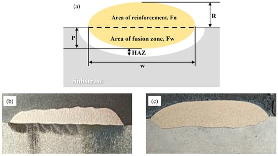 (a) Schematic representation of the geometric parameters of the cross-section of the final material after deposition of the clad onto the substrate material, depicting the area of reinforcement (Fn), area of fusion (Fw), heat-affected zone (HAZ), clad layer height on the substrate material (R), depth of clad penetration into the substrate material (P), and width of the clad across the x-plane (w). (b) Cross-sectional view of sample L1. (c) Cross-sectional view of sample P2.