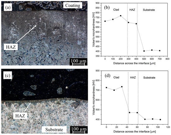 Digital micrograph of the cross-section of investigated sample showing the coating/cladding area, the heat-affected zone (HAZ) and the substrate area (Left), and microhardness profile of points taken along the indicated cross-section (Right). (a,b) Sample L1, (c,d) Sample P2.