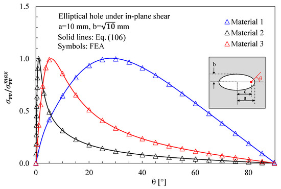 The stress distributions in plates with an elliptical hole under tension, in-plane shear and out-of-plane shear are presented in Figure 5, Figure 6 and Figure 7, respectively, considering three different materials. In particular, in Figure 5, the normalized stress components and along the horizontal axis, derived from Equation (23), are compared with the results from the numerical analyses carried out on orthotropic finite size (150 mm × 150 mm) plates under pure tension. As evident, the accuracy of Equation (23) is noteworthy also in the presence of a finite-size solid.