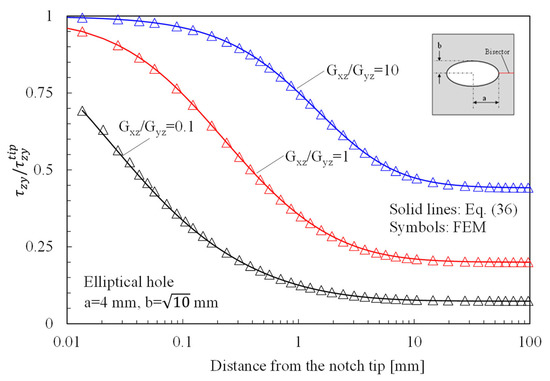 In Figure 7, instead, the attention is focused on out-of-plane shear stresses, evaluated along the bisector line of elliptical holes in orthotropic plates subjected to Mode 3 loadings. Numerical results were obtained by considering three different materials () and compared with the predictions based on Equation (36).