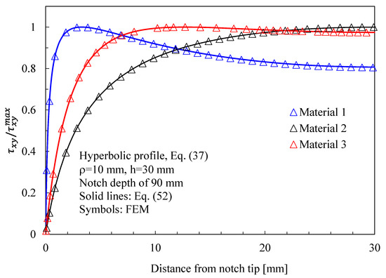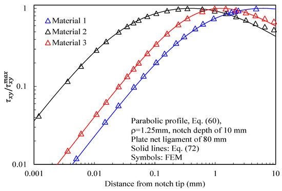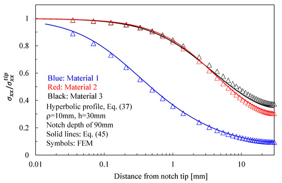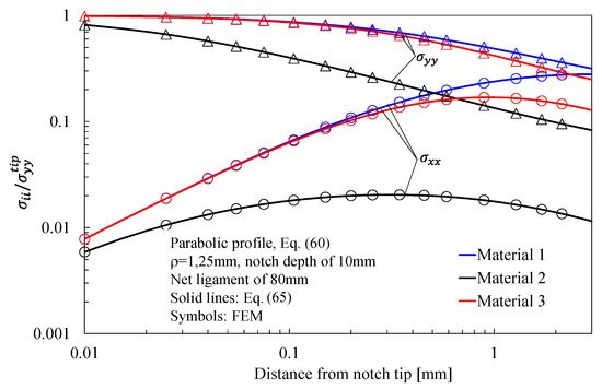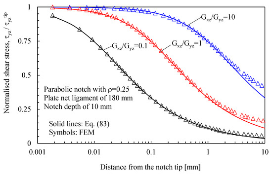 In more detail, the results for the stress fields arising in plates with parabolic notches (blunt cracks) under tension, in-plane shear, and out-of-plane shear are summarized in Figure 11, Figure 12 and Figure 13, respectively. Furthermore, for this case, Equations (65), (72) and (83), exact in the case of deep blunt cracks, can be effectively used to characterize the local stress fields arising in finite-size solids.