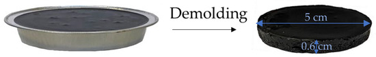 Sample aging was carried out using the long-term aging method, the pressure aging vessel (PAV). Usually, PAV conditions are set to 100 °C and 21 bar for 20 h for a 50 g sample (EN 14769 standard [4]). For this study, the conditions reported above were used, except for the aging time and the sample size. For the aging time, the duration was fixed at 24 h. A cup with a 50 mm diameter was used instead of the standard PAV sample pan. The cups were aluminum to allow samples to be demolded (Figure 1). Different sample thicknesses were aged by modifying the quantity of sample asphalt poured into the cup (between 4 and 27 g of asphalt). The conventional degassing step at the end of PAV aging was not performed in order to prevent the oxidized molecules from moving.
