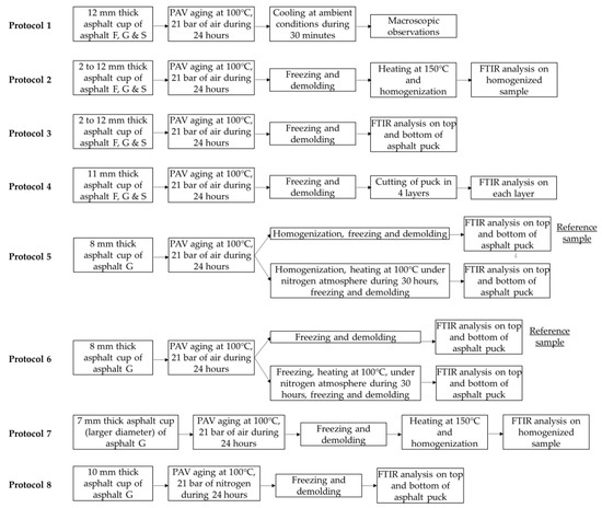 For each asphalt type, cups with different asphalt masses were prepared. Since the size of the cup was fixed, variations in asphalt thickness were obtained by playing on the volume of the asphalt sample poured into the cup. For the rest of this article, the different sample volumes studied were expressed by sample thickness. The quantity of asphalt poured into the cup varied, reaching asphalt thicknesses between approximately 2 mm (≈4.5 g) and 12 mm (≈26.5 g). For this study, eight different protocols were applied (Figure 2).