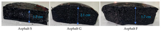 Figure 4. Vertically cut asphalt pucks F, G, and S after PAV aging and 30 min of cooling at ambient temperature and atmospheric pressure. A “foaming effect” was observed. (Protocol 1).