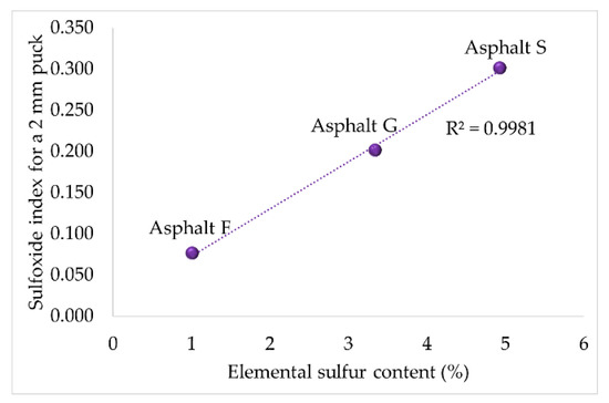 Figure 5. Relationship between the elemental sulfur content and the sulfoxide index calculated for a 2 mm asphalt puck.