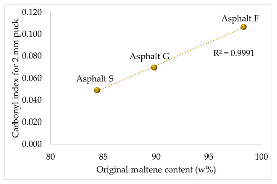 Figure 6. Relationship between the original maltene content and the carbonyl index calculated for a 2 mm asphalt puck.