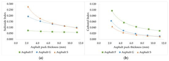 • The average sulfoxide and carbonyl indices decreased with increasing asphalt puck thickness.